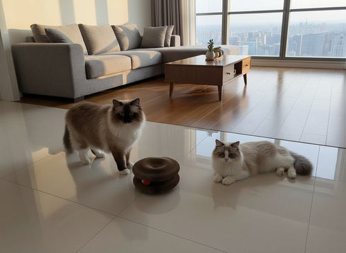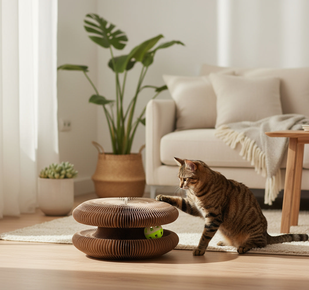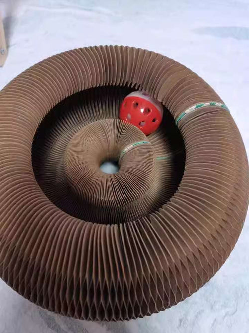 Scratching board + rolling ball keeps cats active and entertained.